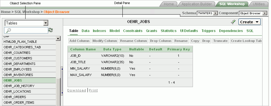 You can navigate to another SQL Workshop component by selecting from the Component list located on the upper right side of the page: